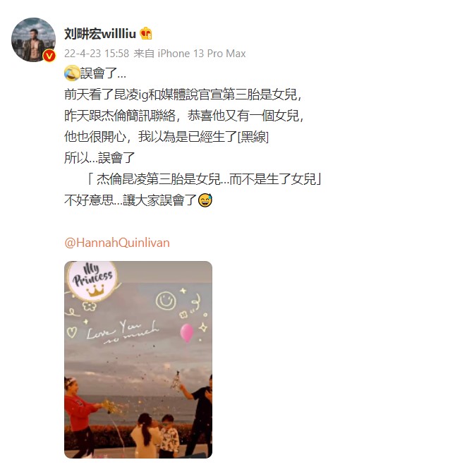 不过,在这件事情发酵后,刘畊宏23日下午发微博澄清只是一场误会,“前天看了昆凌ig和媒体说官宣第三胎是女儿,昨天跟杰伦简讯联络,恭喜他又有一个女儿,他也很开心,我以为是已经生了,所以…误会了。‘杰伦昆凌第三胎是女儿…而不是生了女儿’,不好意思…让大家误会了。”