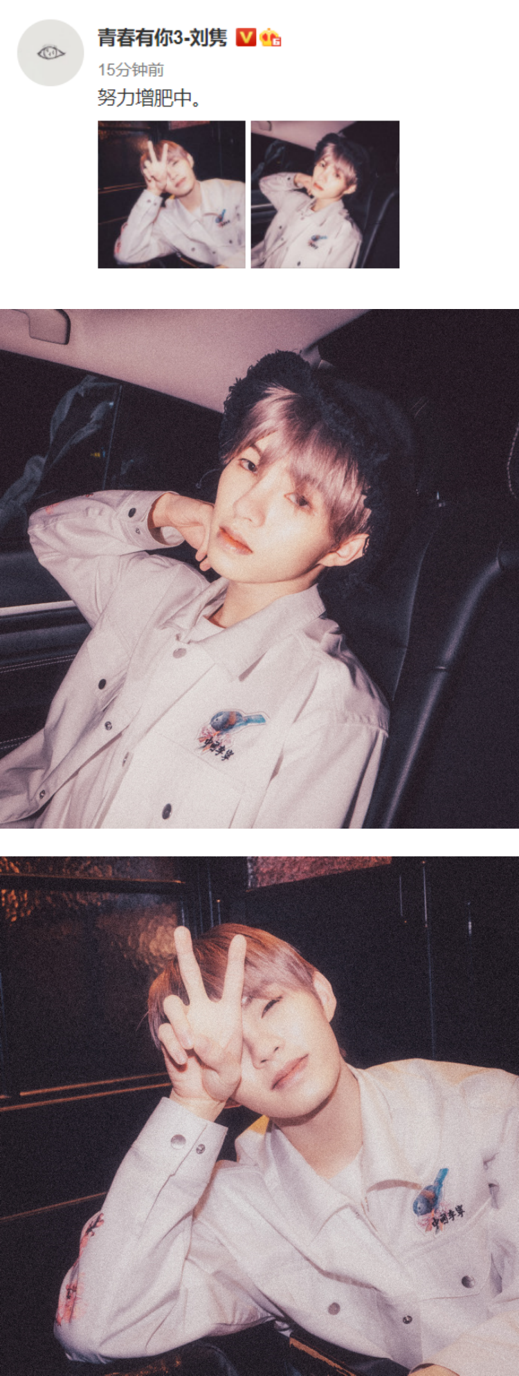 没想到,刘隽今天(20日)终于发文,晒出两张新鲜的自拍照,写道:“努力增肥中”,不仅如此,他也更换了微博头像,从原先的《青春有你3》制服照,更改成画着一只眼睛的手绘相。