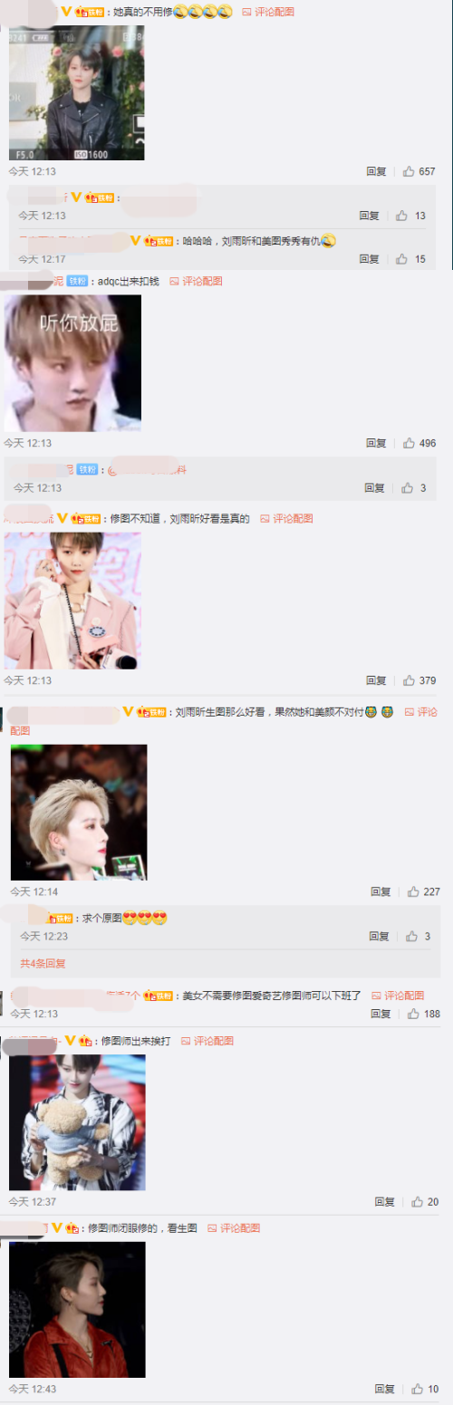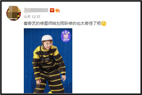 然而有网友认为,节目修图师疑似太“重手”,导致刘雨昕的照片看起来有些奇怪,下巴也成了网红同款蛇精脸,让不少粉丝傻眼表示:“她真的不用修”、“修图师出来挨打”、“修图师是实习生吗?”