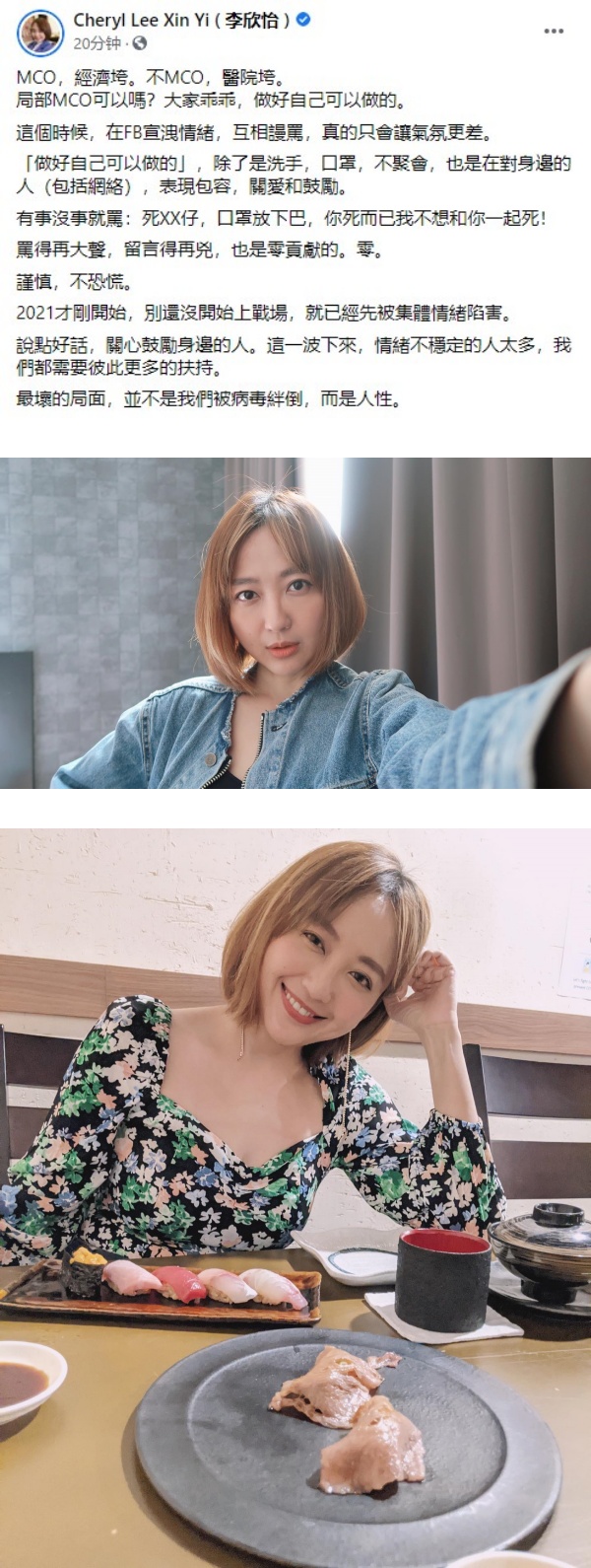 8日早,本地主持李欣怡在Facebook上发文写下,“MCO,经济垮。不MCO,医院垮。”李欣怡忍不住反问,局部MCO,这是否可行?