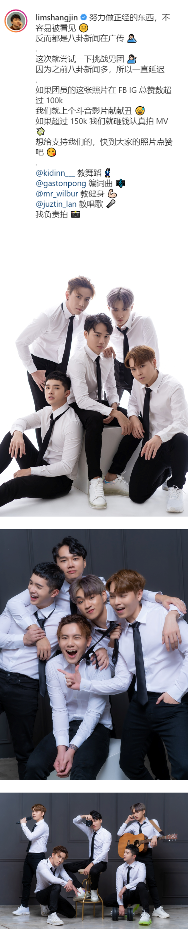 林尚进在贴文中感慨写到,努力做正经事不容易被看见,反而是八卦新闻一直引起注意,他称接下来的新挑战就是做男团!林尚进称,如果团体照在Facebook和Instagram上累计的赞超过100K之外,他们将发抖音影片,要是超过150K,团体就出MV。
