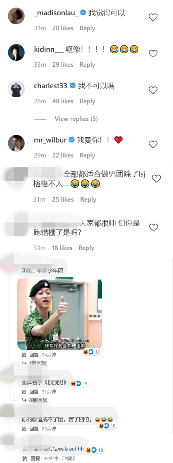 林尚进挑战当男团的贴文曝光后,立即吸引圈内好友以及网友留言,“我觉得可以”、“全部都适合做男团除了lsj格格不入”、“大家都很帅 但你是跑错棚了是吗?”、“团体名字《顶顶男》”等。