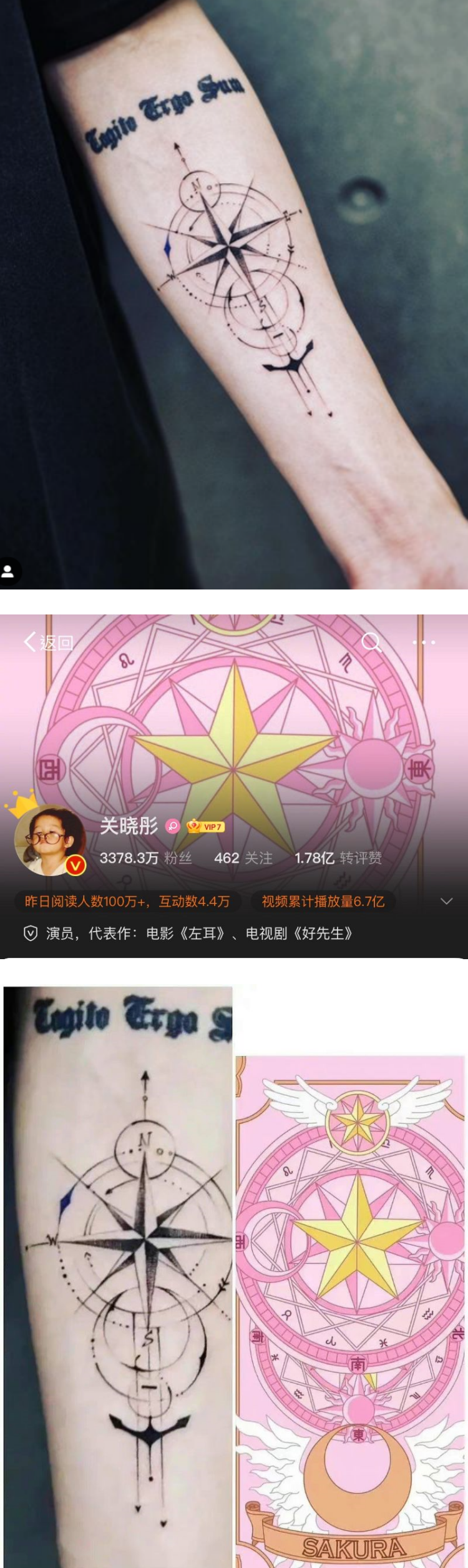 鹿晗昨天(21日)在IG秀出自己手臂上的纹身,没想到却有眼尖的网友发现,他手臂上的纹身图案与关晓彤微博背景图非常相似,并贴出对比照。