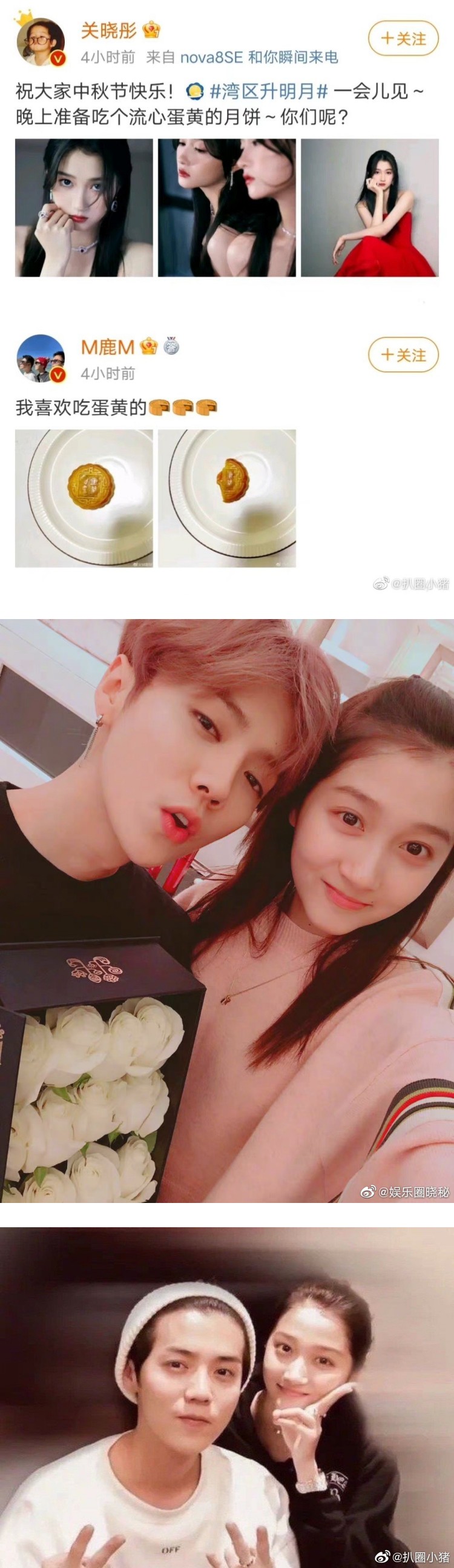 不仅如此,关晓彤21日在微博发文祝贺中秋节,并写道:“晚上准备吃个流心蛋黄的月饼~你们呢?”没想到鹿晗随后就发文,表示:“我喜欢吃蛋黄的”,并晒出流心蛋黄月饼,似乎是在隔空回应女友的喊话。