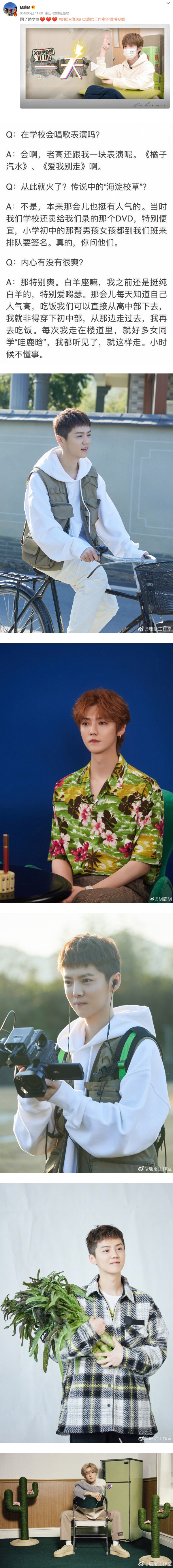 提及中学时期在学校演出、做表演,鹿晗说自己曾和老高一起演唱《橘子汽水》、《爱我别走》,也因为这样累计了一部分的粉丝,“小学初中的那帮男孩女孩都到我们班来排队要签名”。