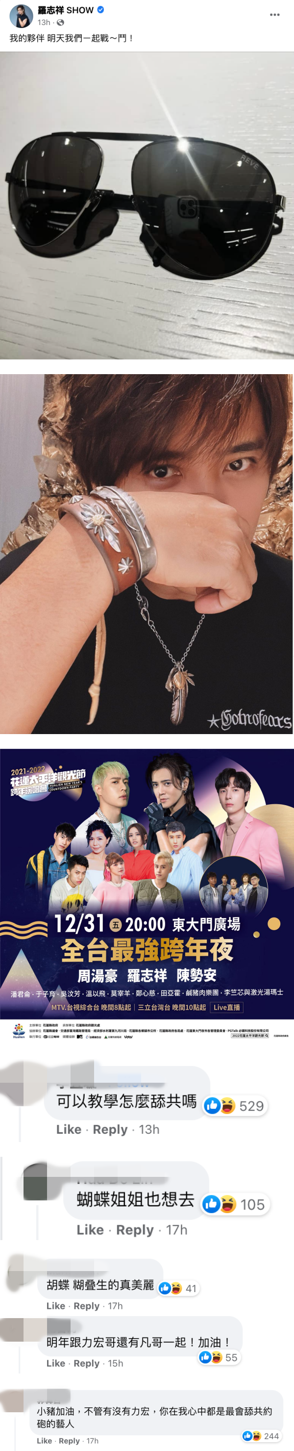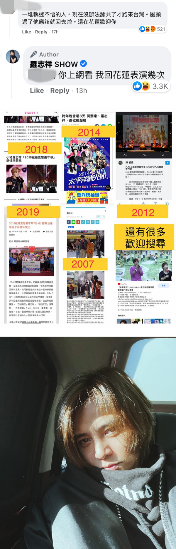 一名网友抨击:“一堆执迷不悟的人。现在没办法舔共了,才跑来台湾。风头过了,他应该就回去啦。还在花莲欢迎你”,结果罗志祥亲自上线回应:要对方上网查资料,喊话“我回花莲表演几次”,希望对方能够看他过去对花莲的贡献,再来批评他。