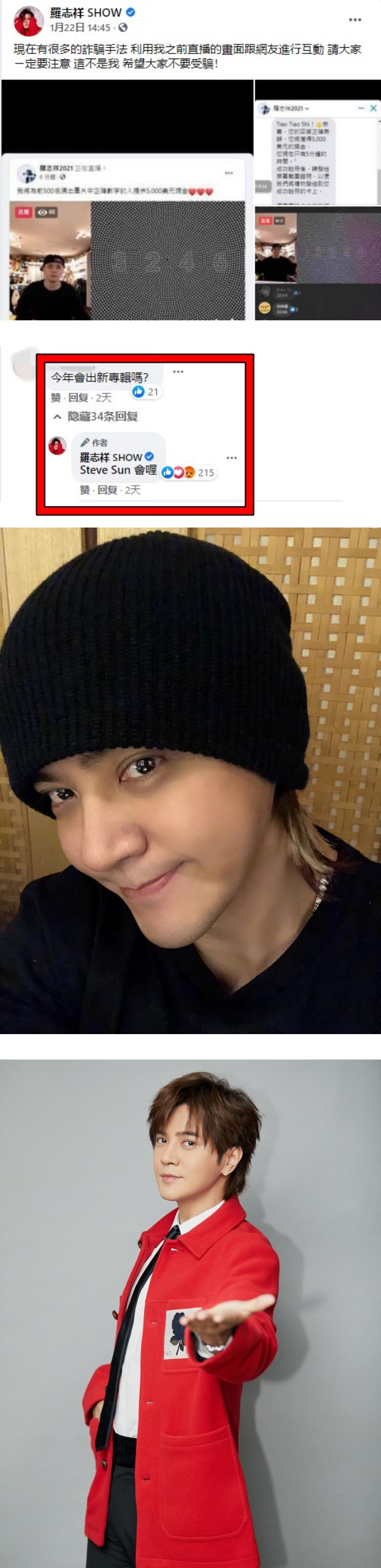 日前,罗志祥在Facebook上发文指,自己过去的直播画面被诈骗集团用来做直播和网友互动,罗志祥叮咛网友千万别上当。随后,有网友问罗志祥,“今年会出新专辑吗?”罗志祥大方回复,“会喔!”