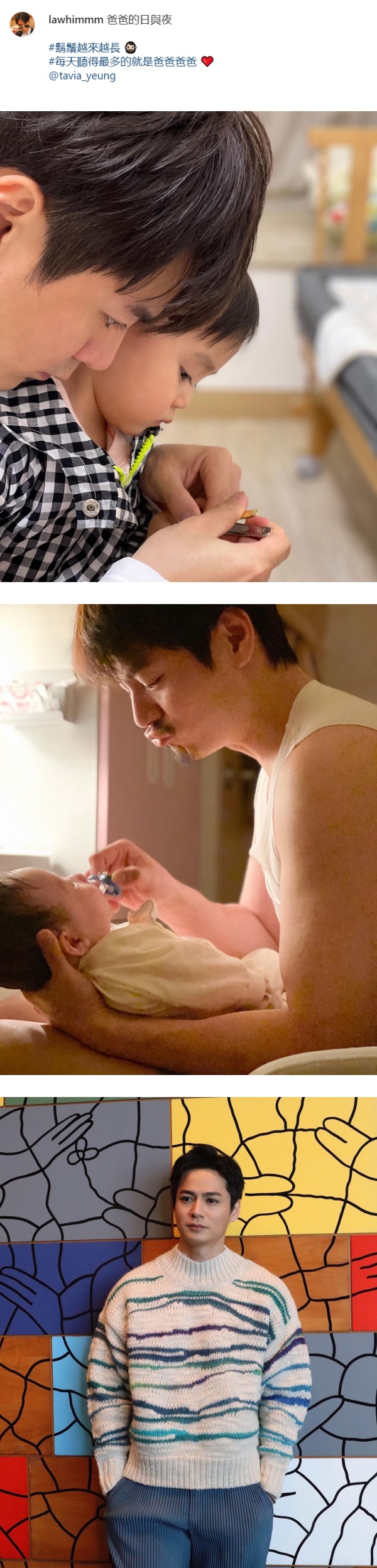 罗子溢贴出两张照顾儿子以及替女儿剪指甲的照片,图中看到他满脸胡子,他笑说这就是爸爸的日常生活。