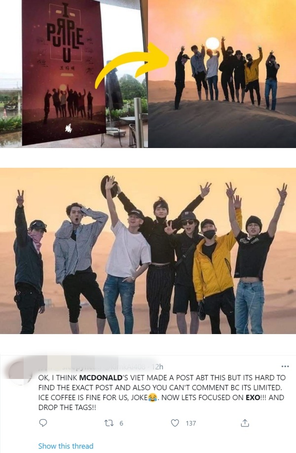 粉丝晒出越南McDonald's贴着的BTS套餐宣传海报,透露上面印着的是EXO早前到访杜拜留下的照片:“对于这个错误,我们需要一个合理的解释,BTS是你的合作伙伴!”