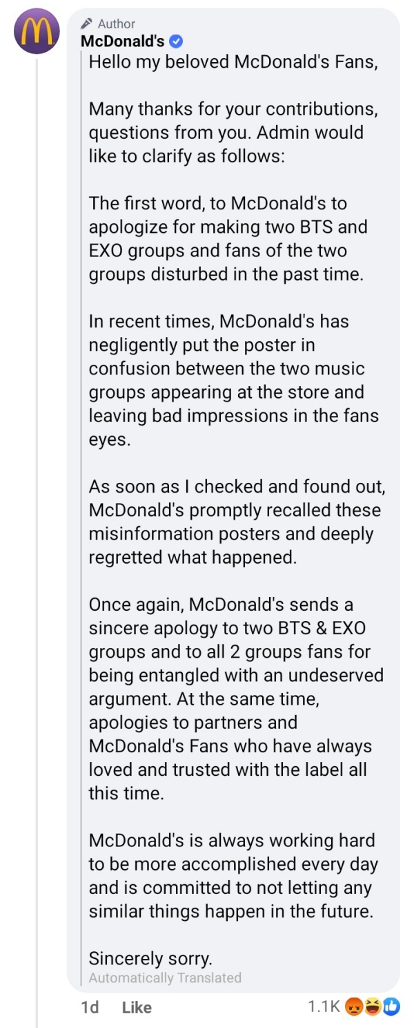 此乌龙事件火速在社交网传开,许多人认为McDonald's犯了非常离谱的错误。另外,也有网友表示错误是别人所犯,希望两个团体的粉丝不要互相责怪。