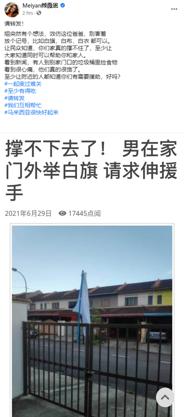她表示当看到有人因为太饥饿,到垃圾桶捡食物的报道时,觉得很心痛:“至少让附近的人都知道你们有需要援助,好吗?”文末,颜薇恩hashtag“我们互相帮忙”、“一起度过难关”、“马来西亚很快好起来”等词条。