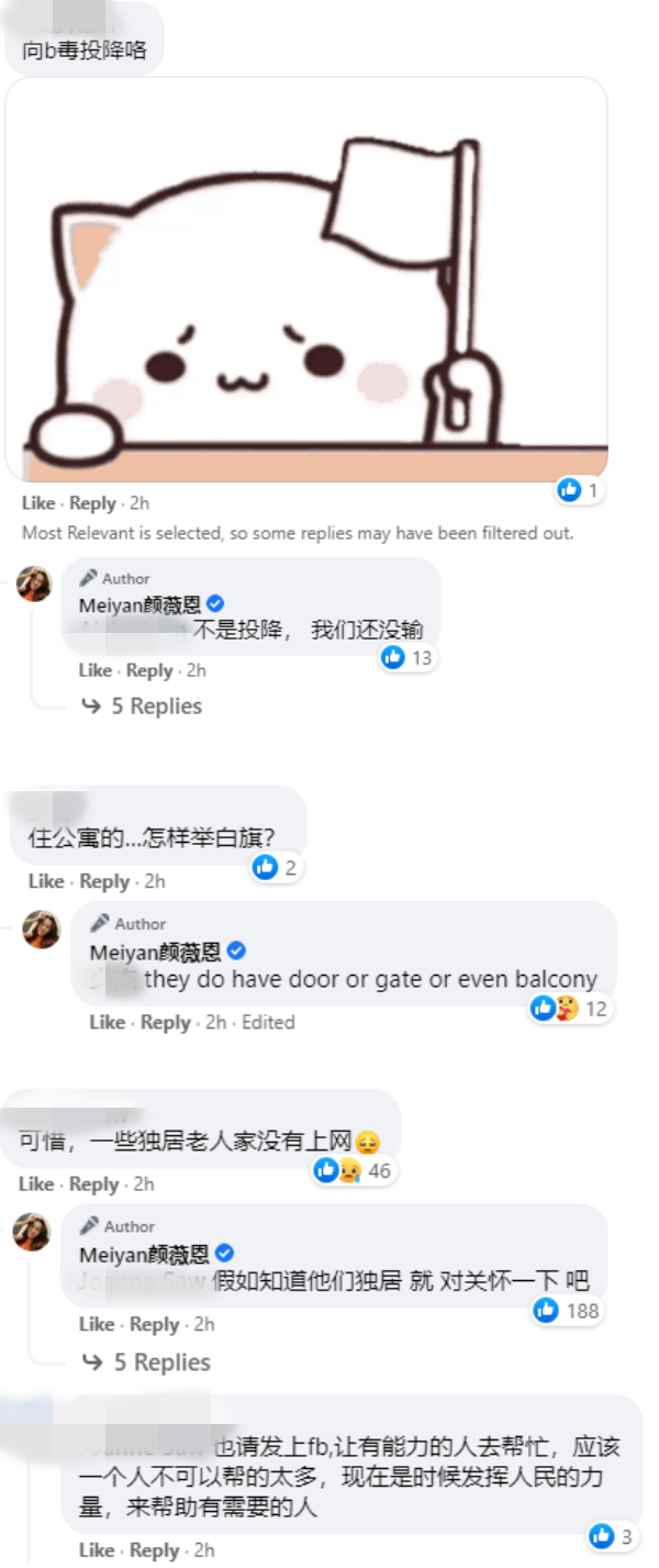 有网友在帖子下留言:“向病毒投降咯”,她则回应“不是投降,我们还没输”。有人表示不会上网的独居老人可能不知道这项做法,颜薇恩也表示大家可以多帮忙:“假如知道他们独居 就 对关怀一下 吧”。