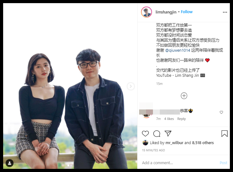 大马情侣档网红林尚进、秋雯6日宣布分手,女方先提议,两人和平结束2年恋情。