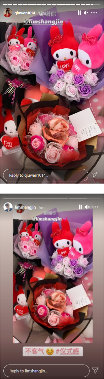 秋雯在宣布分手的影片释出后,在Stroy分享了林尚进送的花和她最爱的Melody卡通娃娃,并感谢他。