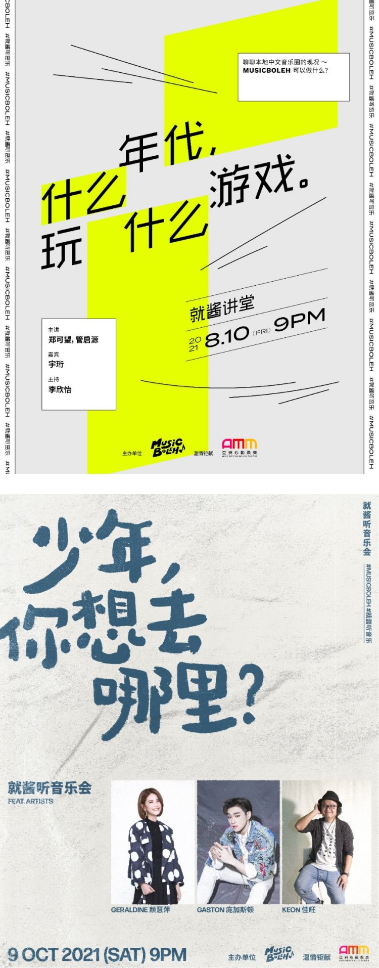 Music Boleh中文音乐联盟推出的首场活动就是即将在10月8日举办的第一场“就酱讲堂”,主题为《什么年代,玩什么游戏》,由郑可望、管启源担任主讲人,宇珩担任嘉宾,而主持人则是李欣怡,共同聊聊本地中文音乐圈的现况。