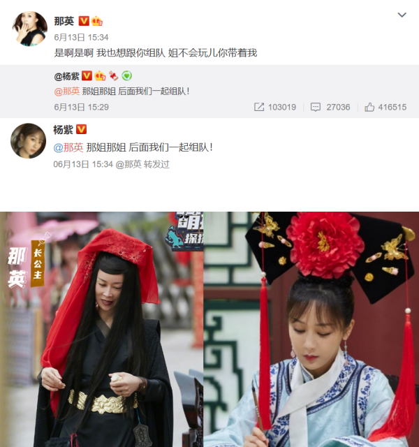 13日午间,杨紫在微博上发文,“那姐那姐 后面我们一起组队!”同时也在贴文里标签上那英,随后那英也转发了杨紫的贴文写下,“是啊是啊 我也想跟你组队 姐不会玩儿你带着我”,两人大方互动打破各种不合传闻,杨紫也赶紧留言,“得咧~[心][心][心]咱一起赢他们!”。