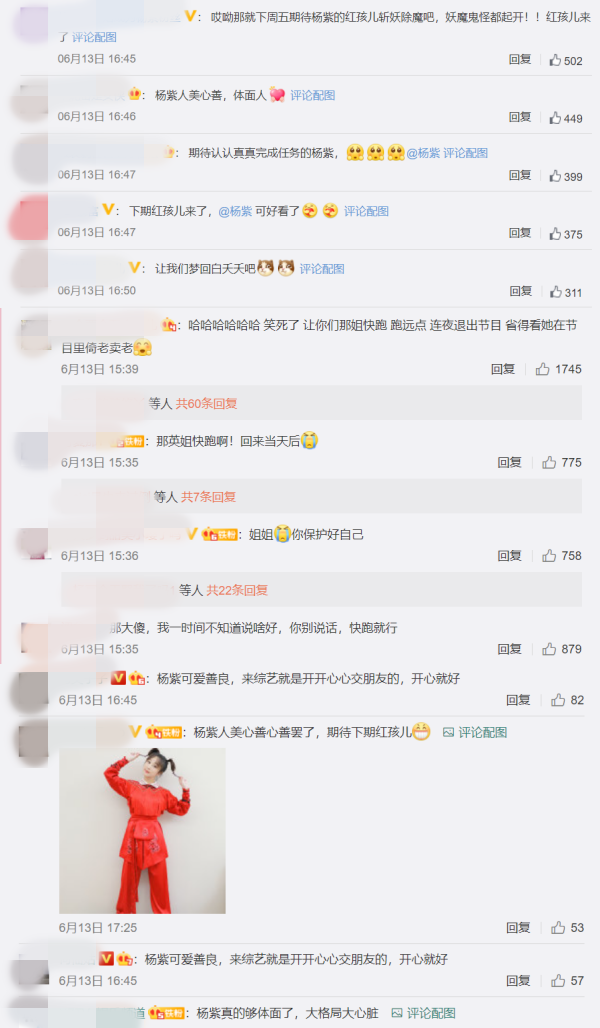 网友看了那英和杨紫的隔空互动后大赞,“杨紫可爱善良,来综艺就是开开心心交朋友的”、“真的够体面了,大格局大心脏”、“我真的哭了你怎么这么好”“姐姐 你保护好自己”等。