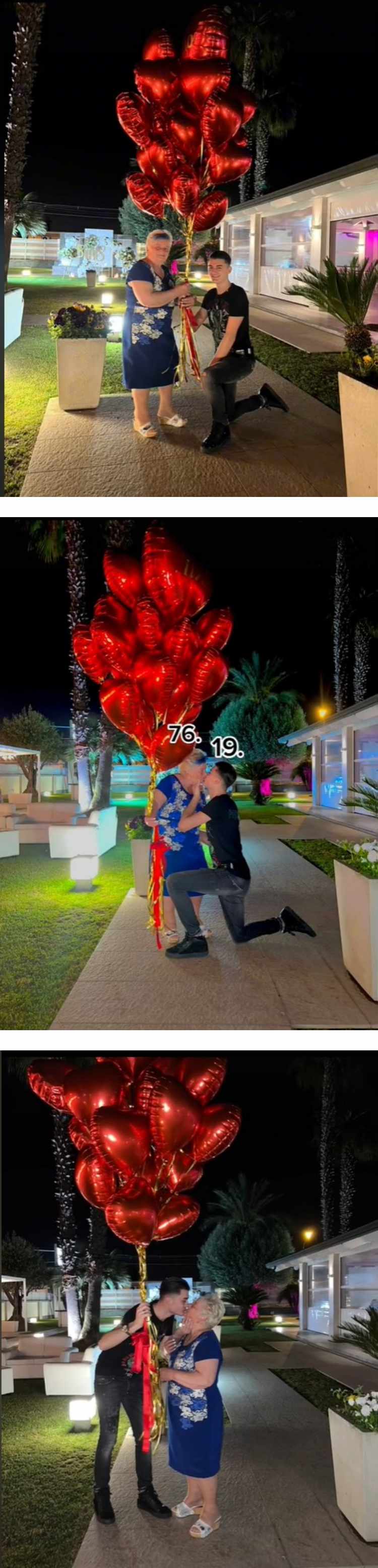 19岁的Giuseppe D'Anna 23日向76岁的女友求婚,并在隔天上传视频,只见他拿着一大串的红色爱心气球并单膝下跪,更捧着女友的脸嘴对嘴亲吻,之后还秀出超大颗钻戒与出游的照片,感情显然相当甜蜜。