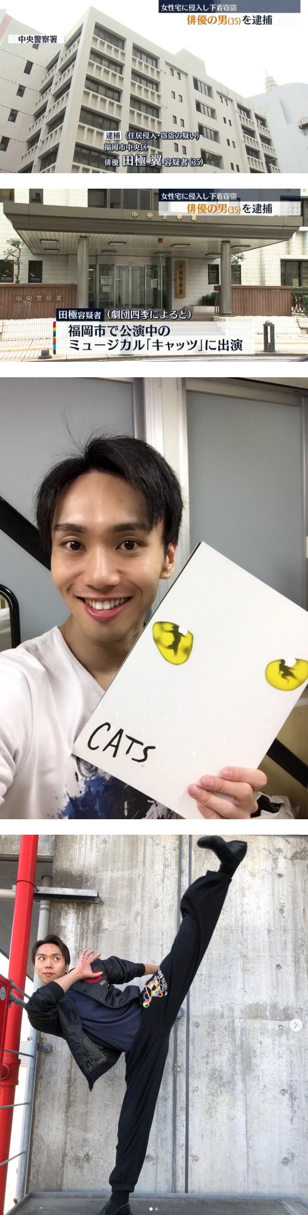 据悉,田极翼曾在2月10日至25日期间多次闯入中央大楼未锁的房间,还在家中被搜出许多女性的内衣裤!他现正在福冈演出音乐剧《猫》,被逮捕后知名剧团“剧团四季”随即发布声明,说明田极翼是自由契约并不是旗下演员,对于受害者女性以及关注音乐剧的观众表达歉意,同时也立即宣布和演员的事务所中止演出契约,形同开除。
