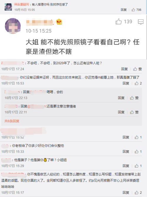 对于曝出恋情的爱豆,留下来的粉丝批评的不是爱豆,而是女方。当时曝出任豪劈腿的网红“sue小姿”,被不少粉丝留言谩骂:“先照照镜子好吗?”、“任豪又不瞎”、“有人搭理你吗?别找存在感了。”