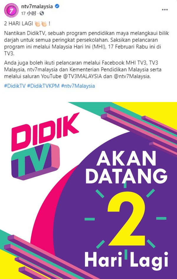 大马电视频道ntv7官宣,即将在本周四(18日)起正式改为教育部的教育频道“DidikTV KPM”;换句话说,ntv7将正式走入历史。