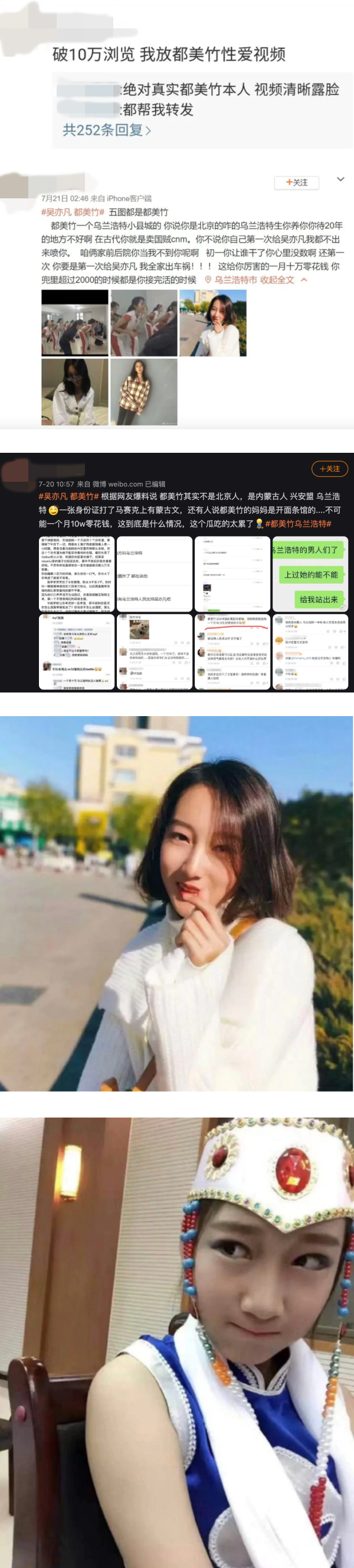 据悉,这名女网友看起来非常不满都美竹的所作所为,除了发文附上多张都美竹旧照,更怒斥她欺骗自己的出身地,爆料她不是北京人而是内蒙古乌兰浩特人,并指出她的“第一次”不是给了吴亦凡,疑似暗指她曾进行性交易。
