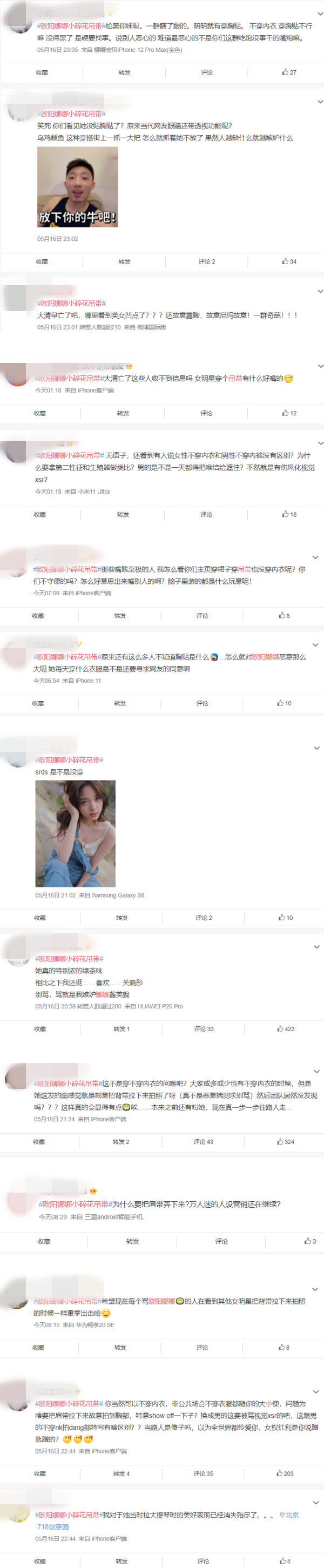 然而,部分网友却指出她没穿内衣以及故意将肩带拉下来拍到胸部:“特意show off一下子?”、“为什么要把肩带弄下来?万人迷的人设营销还在继续?”、“我刚想夸一句还真挺好看,但是她确实没穿bra,我一开始完全没看出来”,也有人力挺欧阳娜娜,表示支持穿衣自由:“女明星穿个吊带有什么好嘴的”、“明明就有穿胸贴”。