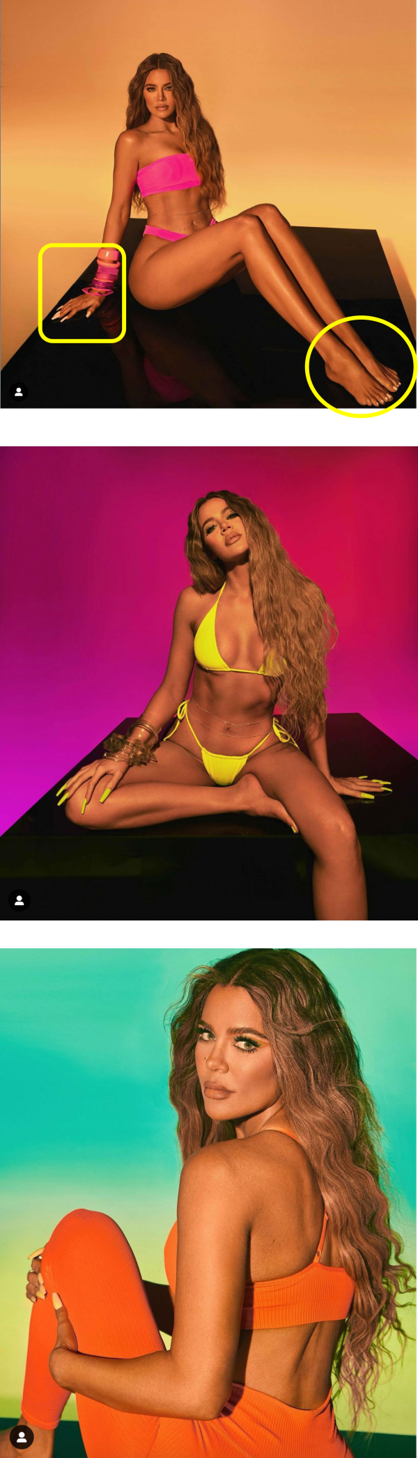 据悉,穿上荧光粉红色比基尼的Khloe 在照片中大晒长腿,但是网友们发现她的右脚竟然有6只脚趾,怀疑是她修图修过头惹祸,更指出她的腿长不符合比例、手指也诡异的变形,纷纷留言嘲讽:“这张照片有什么是真的?”、“这个脚趾头不对劲”、“六指?”、“如果她照片都跟本人一样,那她每次都长不一样”、“P 图过头了” 等。