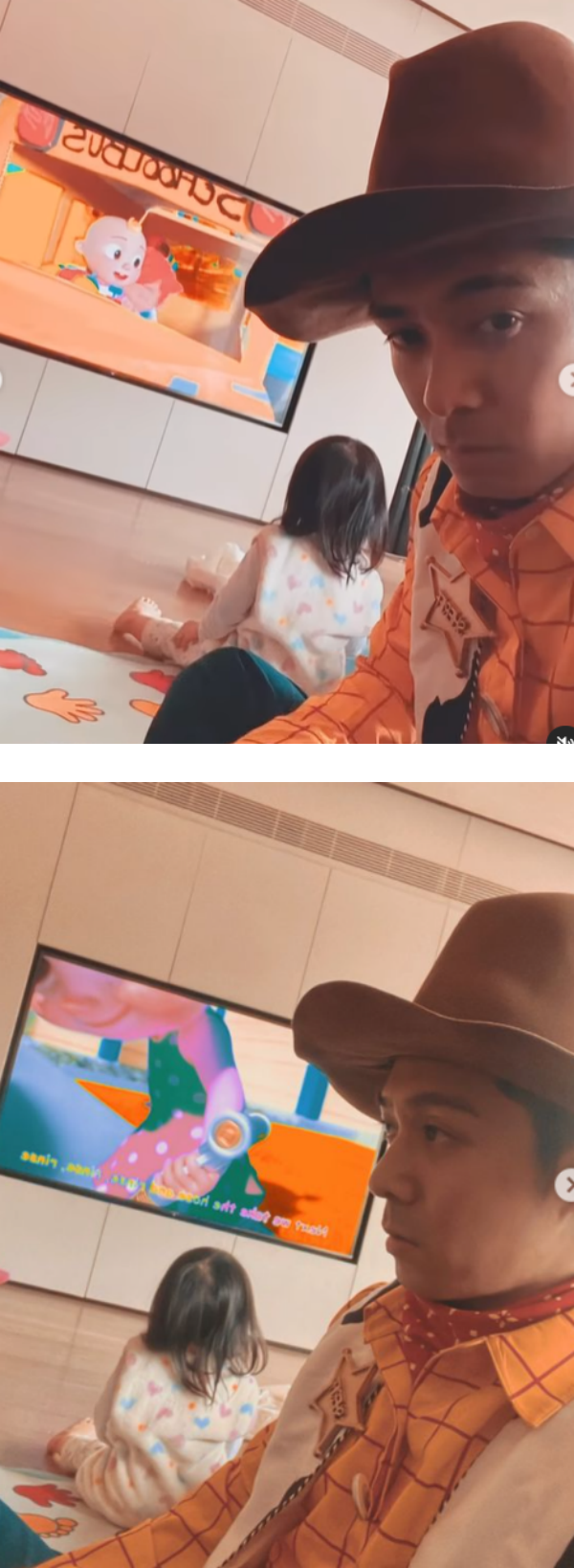 周柏豪晒出女儿看电视的背影,只见她全神贯注盯着卡通片《Cocomelon》的主角JJ,完全无视身后一脸无奈的“胡迪爸爸”!