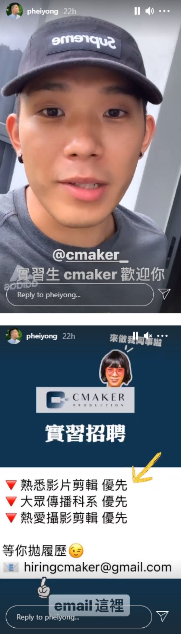 培永和姐姐Casey去年创立新公司CMAKER,他昨天(13日)在个人IG story公开招聘实习生,只要熟悉影片剪辑、热爱摄影拍摄的大众传播科系学生,无论是在读生或刚毕业的新人,都能投递简历,“我们希望有机会当同事。”