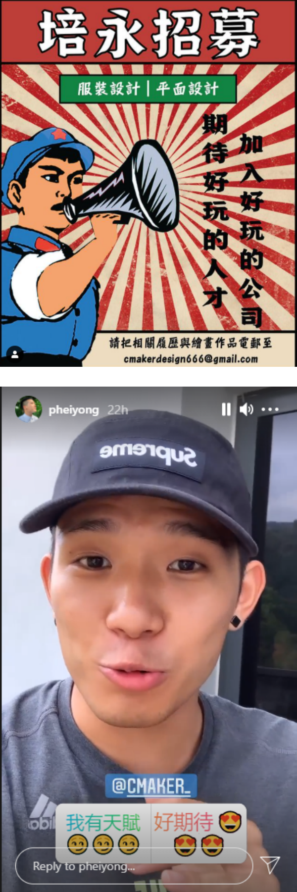 另外,培永也宣布将创立个人潮牌,“只要你对服装设计或者平面设计有兴趣,可以马上投简历!”