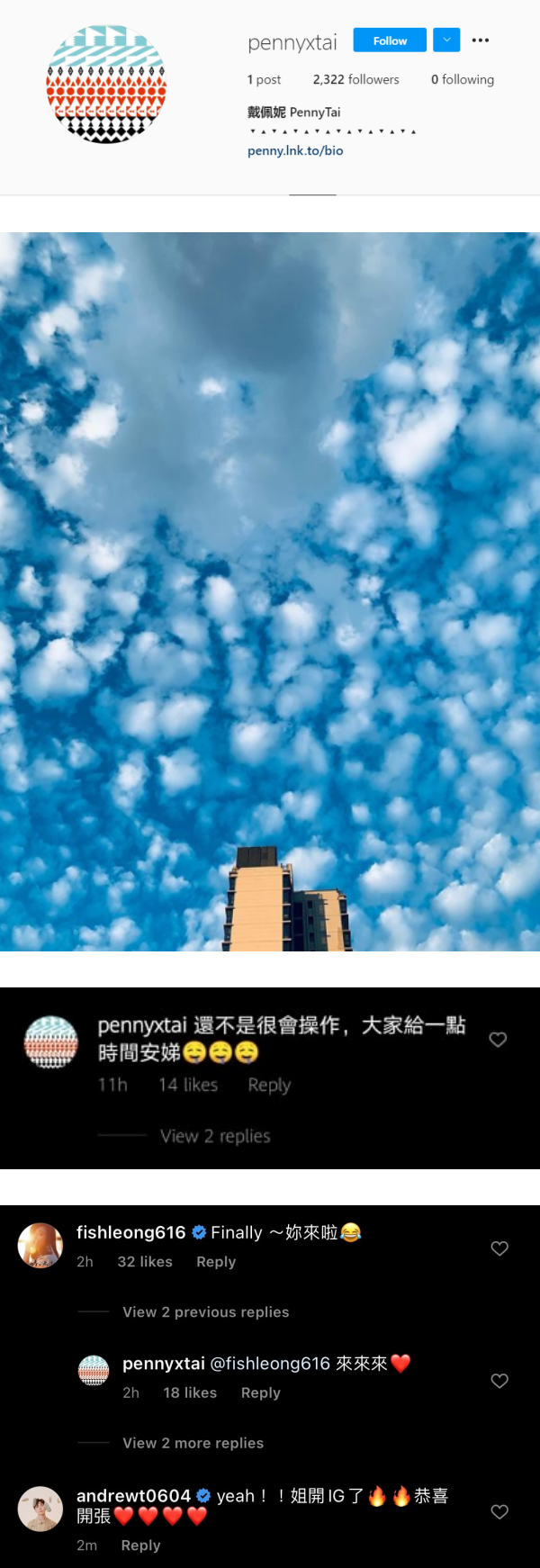 戴佩妮的账户名称为“pennyxtai”,目前只有一张天空的照片,附文:“出发”。得知她开通IG后,好友梁静茹、陈势安、魏如萱等好友火速关注,梁静茹还留言:“Finally~你来啦!”戴佩妮则表示自己还不是很会操作IG,“大家给一点时间安娣”。