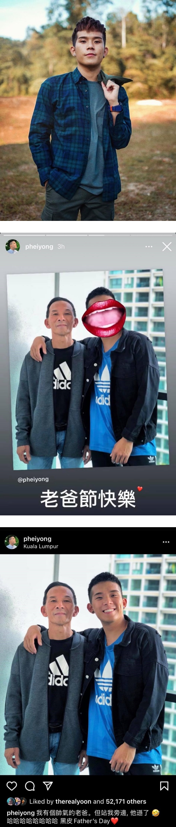 6月20日是父亲节,圈中艺人、YouTuber都陆续在社交媒体上分享自己和爸爸的合照;《干爹业配吧!》第二季“幕后推手”培永也在Instagram Story上分享了和陈爸爸的同框照。