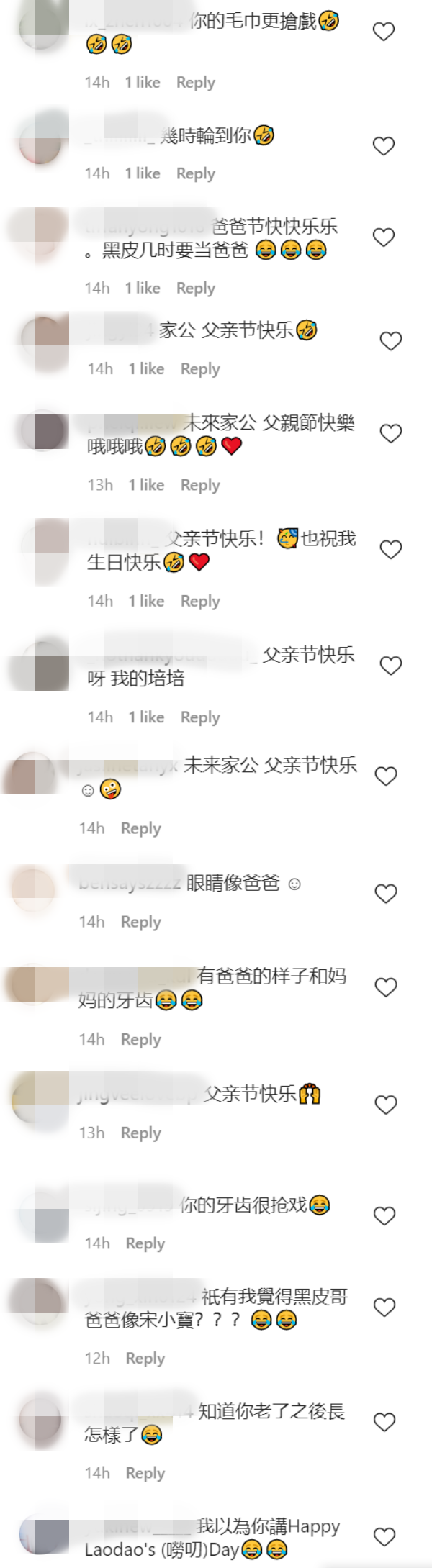 网友看了培永和家人的同框照后搞笑留言,有者直接认陈爸爸做“家公”,“爸爸节快快乐乐 。黑皮几时要当爸爸”、“家公 父亲节快乐”、“未来家公 父亲节快乐哦”、“眼睛像爸爸”等。