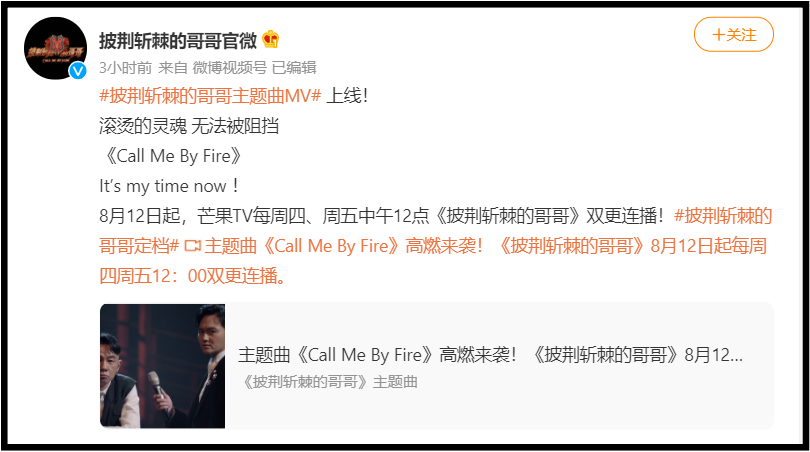 《披荆斩棘的哥哥》今天释出主题曲MV《Call Me By Fire》MV,并宣布将在12日首播,每周四、周五中午12点更新。