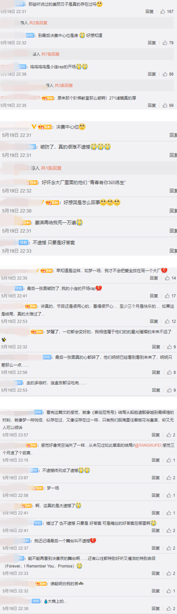 有追《青春有你3》的网友,看到这些照片十分感慨:“那些听说过的美丽日子是真的存在过吗”、“破防了,真的很难不遗憾”、“好想哭是怎么回事”、“走的多临时,连盒饭都没吃完...”、“好像一切都凭空消失了一样”、“很遗憾,但是不后悔遇见最好的他们”;也有人关注点新奇,惊呼节目滤镜太厚:“原来那个阶梯教室那么破啊!271滤镜真的厚”。