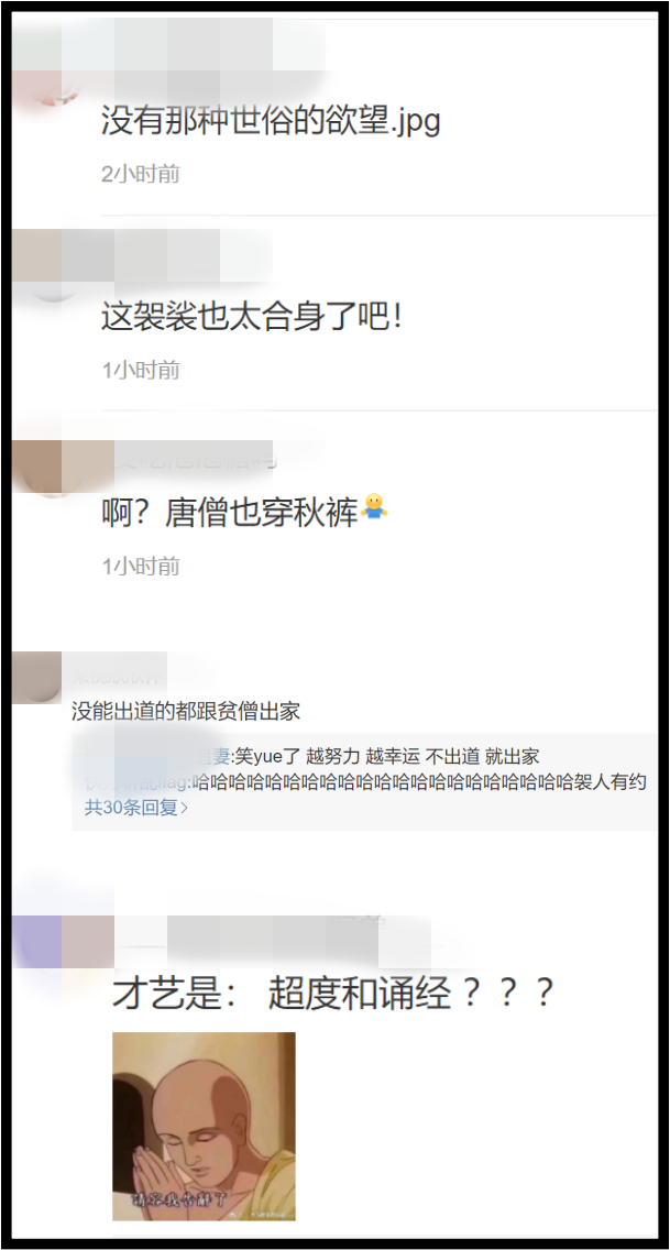 网友被这张恶搞图逗笑,留言:“没能出道的都跟贫僧出家”、“越努力 越幸运 不出道 就出家”、“才艺是: 超度和诵经 ???”、“没有那种世俗的欲望.jpg”。另外,留着一头长发的选手“孙滢皓”也极其抢镜,有人表示他和光头的梁森莫名搭配!