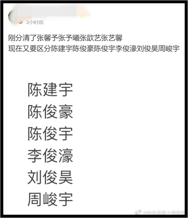 除此之外,《青春有你3》有5位名中带“俊”或名字非常相似的选手,分别是陈建宇、陈俊豪、陈俊宇、李俊濠、刘俊昊和周峻宇,代表“青春制作人”认名字的难度又增加了!