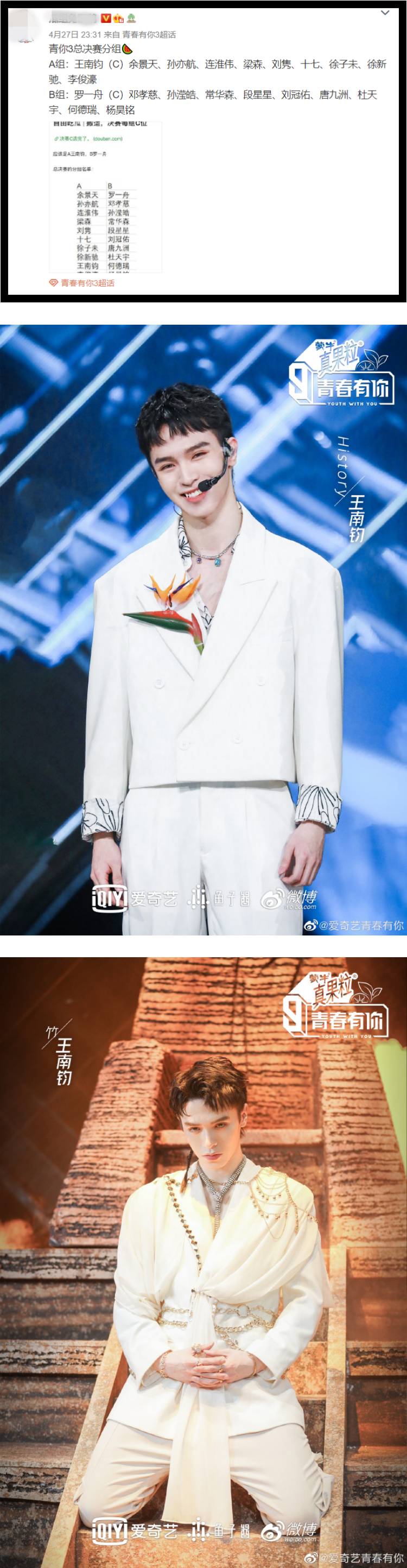 而余景天组的训练生则有孙亦航、连淮伟、王南钧、梁森、刘隽、十七、徐子未、徐新驰、李俊濠。不过让人意外的是,这一组的C位并不是余景天,而是因一直想当C位而被戏称为“南C”的王南钧。