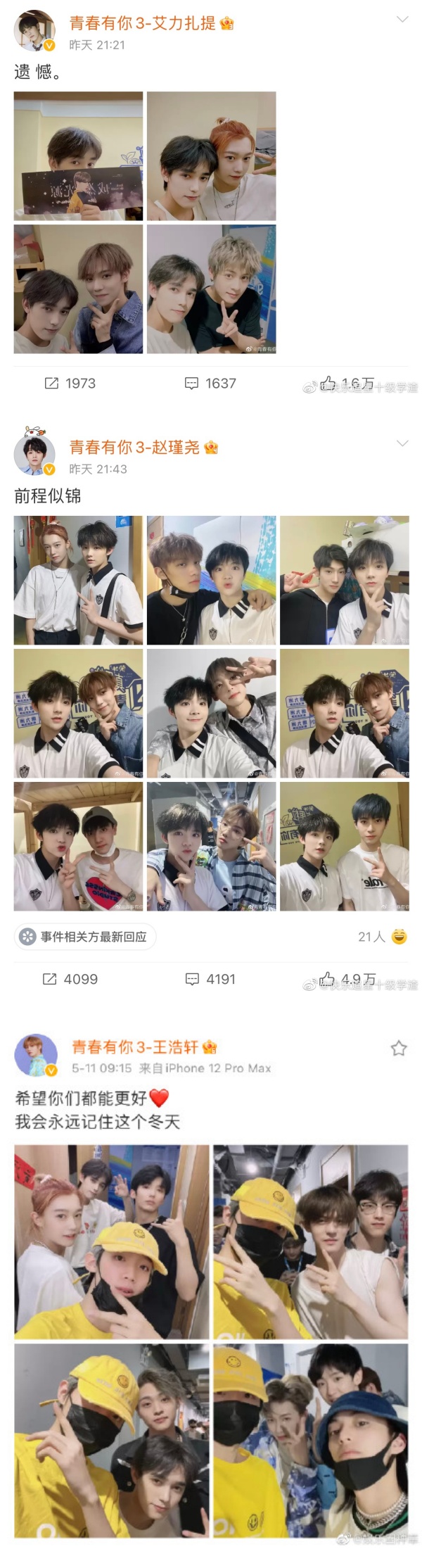 《青春有你3》训练生赵瑾尧、艾力扎提、王浩轩先后分享和决赛圈选手的合照,没想到11日就被网友发现,三人都将一系列合照删除了。