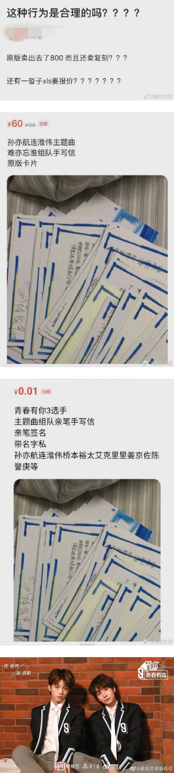 微博传出平台截图,只见照片里有一大沓训练生的手写信。卖家注明是“亲笔手写信”、“亲笔签名”、“原版卡片”,当中有节目中的大热CP“难亦忘淮”(连淮伟&孙亦航)给彼此写的信。