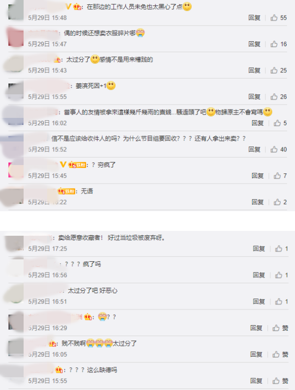 这些信都没有信封,据说还有分原版和复刻。网友也觉得傻眼:“在那边的工作人员未免也太黑心了点”、“太过分了,感情不是用来糟践的”、“当事人的友情被拿来这样几斤几两的卖钱...骚过头了了吧,物归原主不会写吗”、“信不是应该给收件人的吗?为什么节目组要回收???还有人拿出来卖??”、“还给他们啊,这个还要赚钱真的疯了吧”。