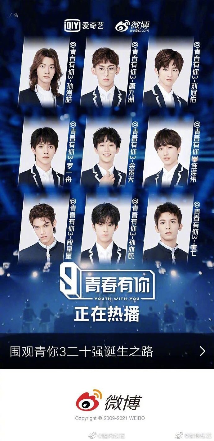 微博的开屏广告24日凌晨登出9名《青春有你3》训练生的照片,顺序与此前网传的第三次顺位名单一模一样,第一至第九名的训练生依序是余景天、罗一舟、连淮伟、唐九洲、孙滢皓、刘冠佑、孙亦航、段星星和十七。