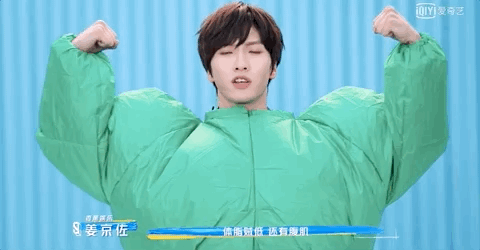 ▼姜京佐穿着绿色充气衣,表示自己是除了能唱跳Rap、还爱整饭和结账的“东北猛男”。