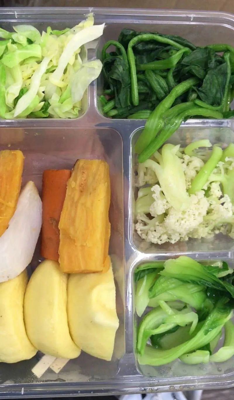 从曝光的照片中,只见便当盒中只有四种水煮青菜,还有一些水果、地瓜等,完全不见肉及饭,非常清淡。