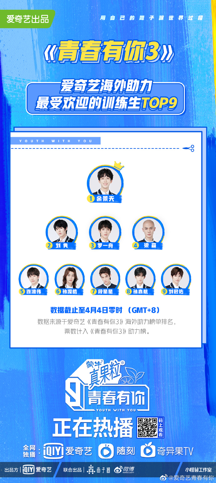 在海外助力榜中,最受欢迎的9位训练生依序是余景天、刘隽、罗一舟、梁森、连淮伟、孙滢皓、段星星、孙亦航、刘冠佑。