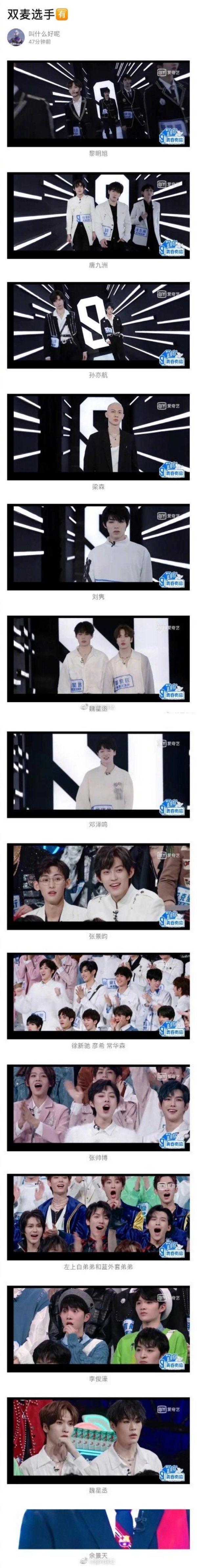 其后有网友根据《青春有你3》初舞台考核的预告片,挖出佩戴两个小蜜蜂的练习生,其中包括来自马来西亚的刘隽,还有黎明旭、唐九洲、孙亦航、梁森、余景天、李俊濠、张景昀、徐新驰、常华森、彦希、邓泽鸣、魏星丞等人。
