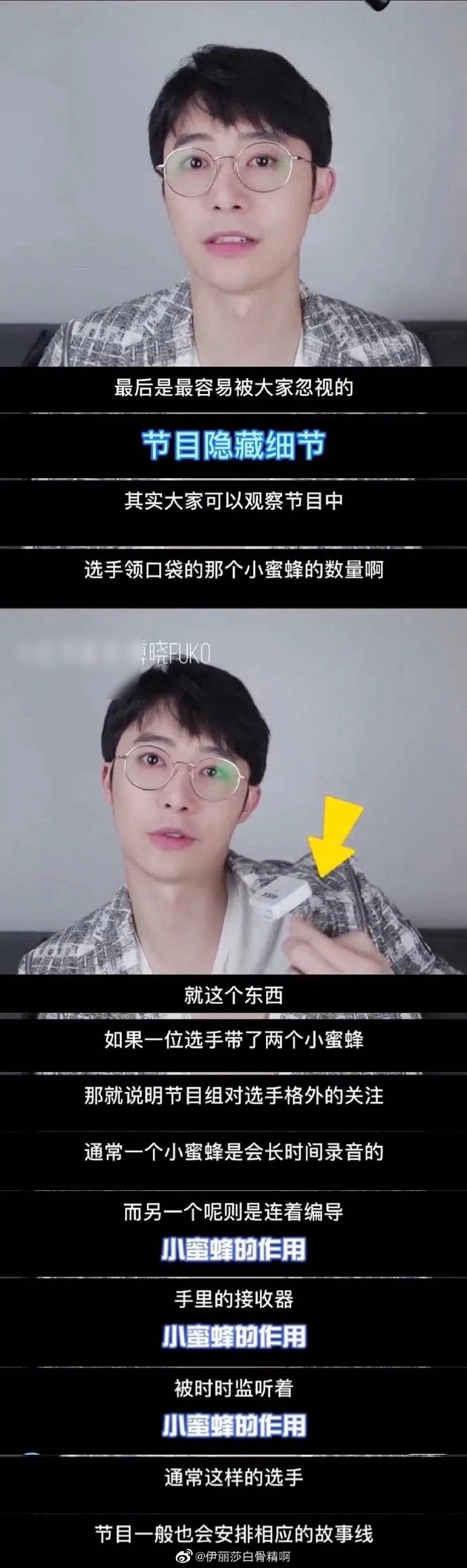 傅晓透露,如果练习生佩戴2个小蜜蜂(麦克风),说明这名练习生是节目组格外关注的重点选手,会被安排相应的故事线。