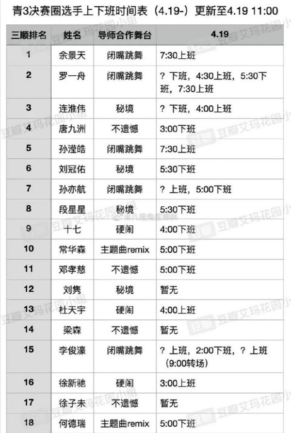 《青春有你3》决赛即将来临,网传一张18位训练生的时间表,可见许多人都是一大早就开始训练,直到接近凌晨才下班。