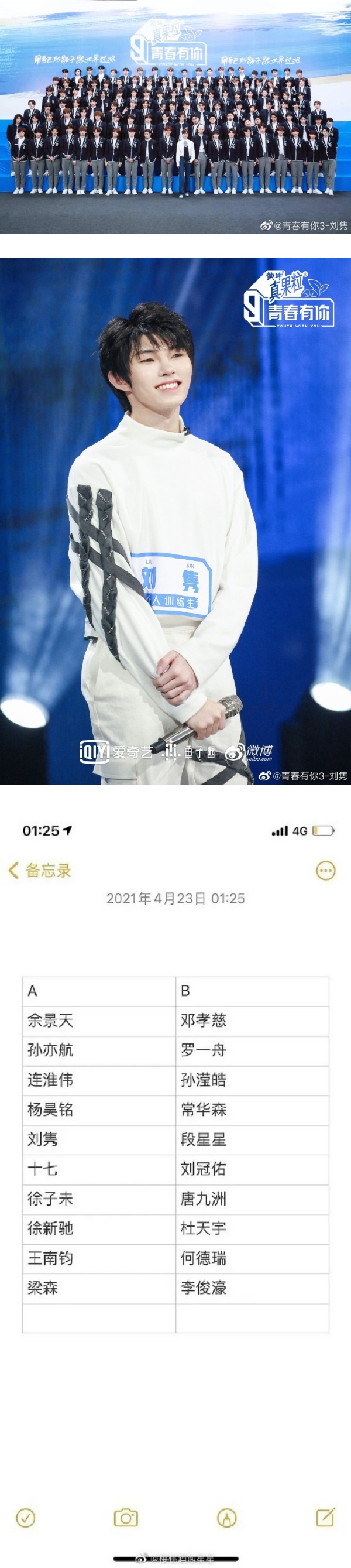 网曝的分组图中看到,总决赛舞台上训练生被分为A、B两组,其中大马籍代表刘隽被分到和余景天、孙亦航等人一组。
